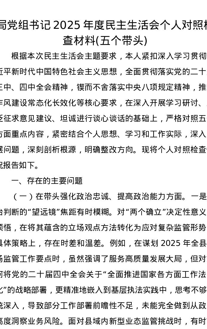 局党组书记2025年度xxxxx个人对照检查材料(五个带头)