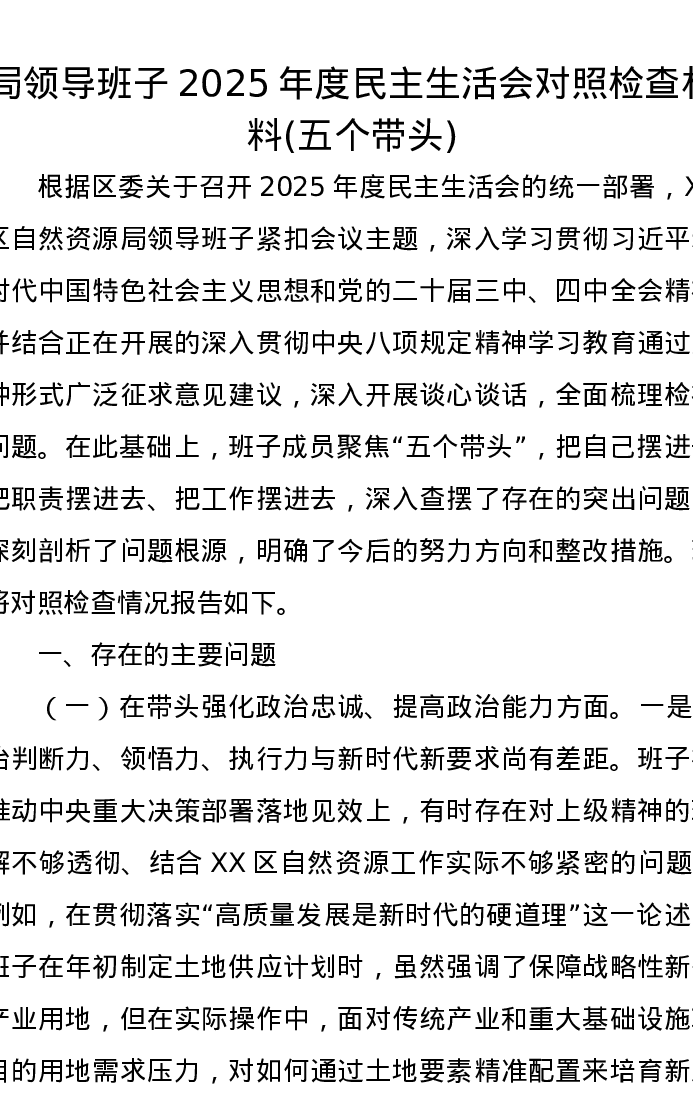 局领导班子2025年度xxxxx对照检查材料(五个带头)