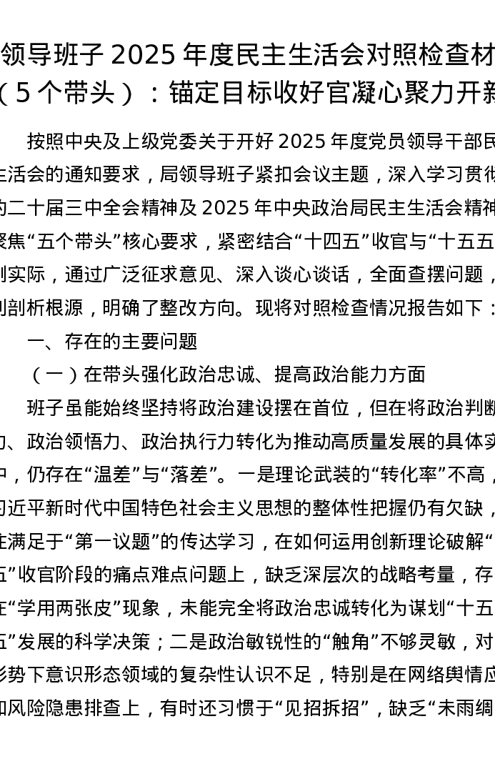领导班子2025年度xxxxx对照检查材料(五个带头):锚定目标收好官 凝心聚力开新局