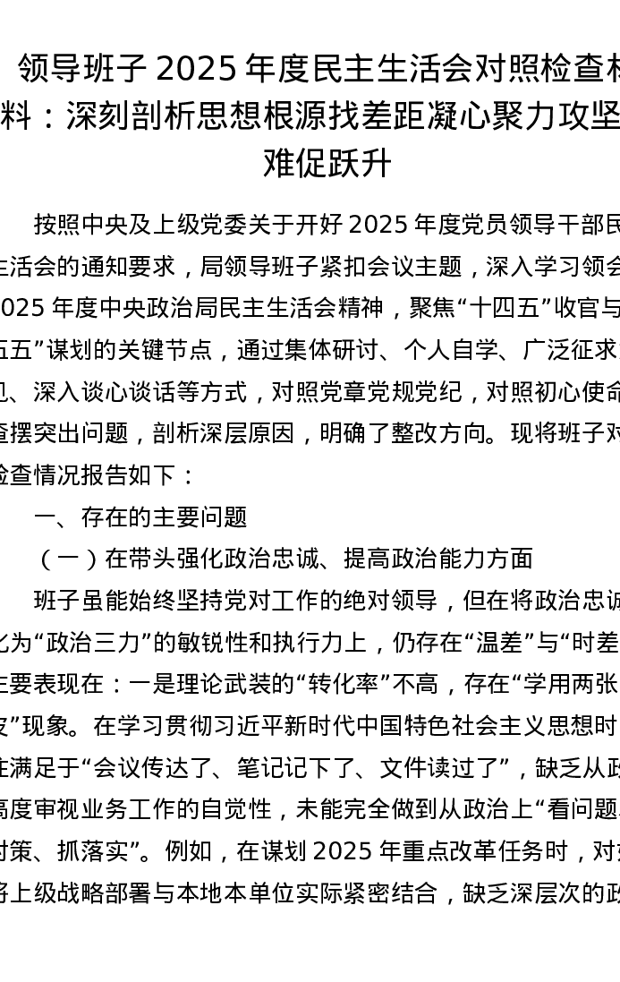 领导班子2025年度xxxxx对照检查材料(五个带头):深刻剖析思想根源找差距 凝心聚力攻坚克难促跃升