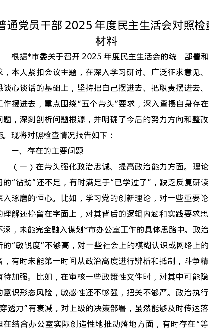 普通党员干部2025年度xxxxx对照检查材料(五个带头)