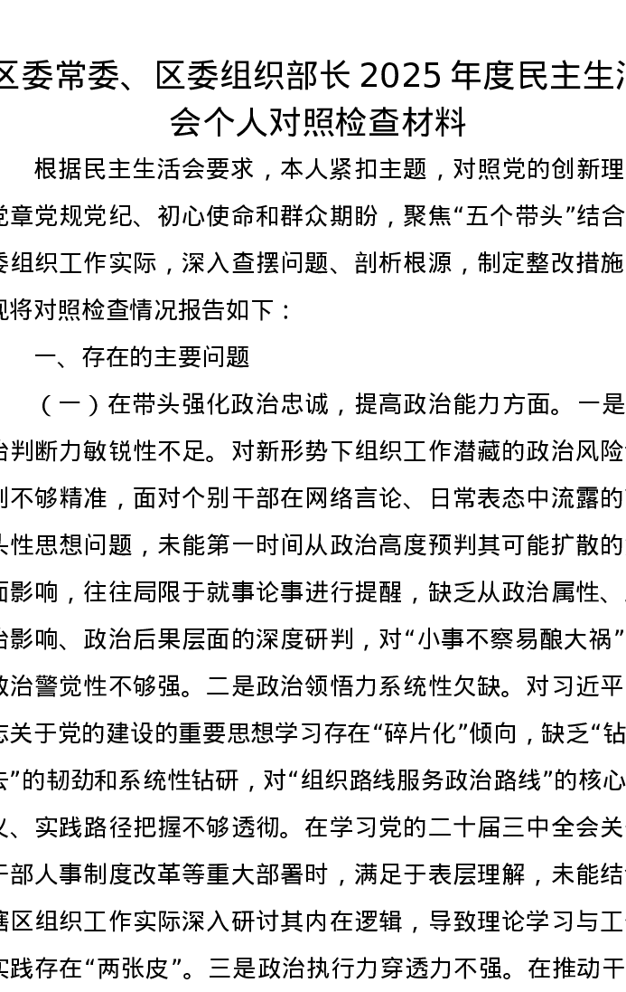 区委常委、区委组织部长2025年度xxxxx个人对照检查材料(五个带头)