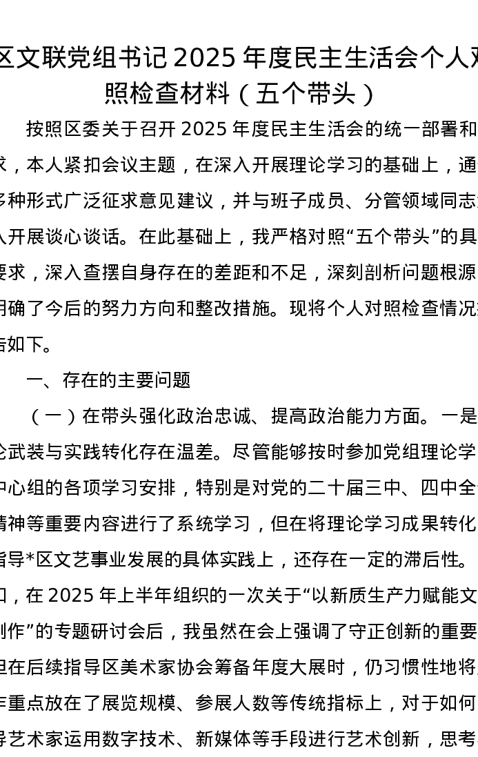 区文联党组书记2025年度xxxxx个人对照检查材料(五个带头)