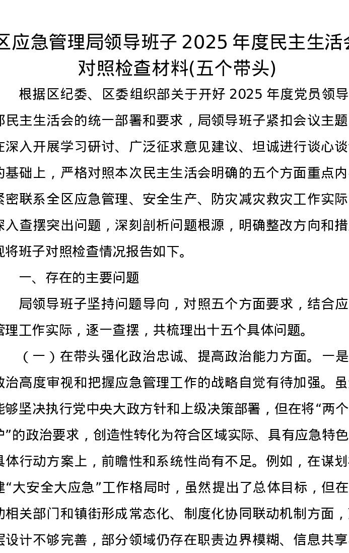 区应急管理局领导班子2025年度xxxxx对照检查材料(五个带头)