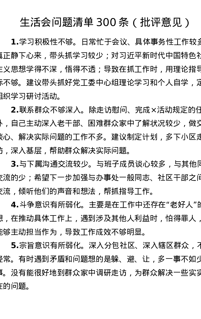 生活会问题清单300条(批评意见)