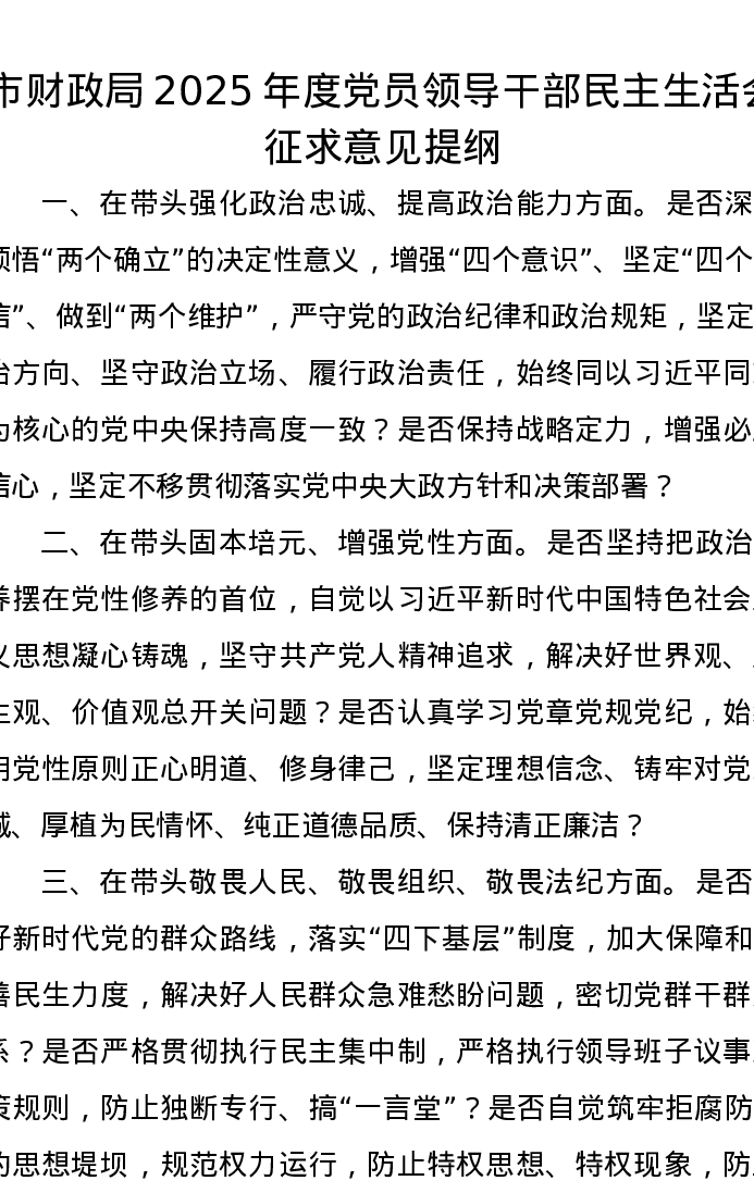 市财政局2025年度党员领导干部xxxxx征求意见提纲