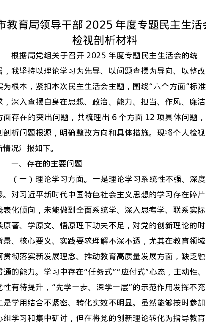 市教育局领导干部2025年度专题xxxxx检视剖析材料