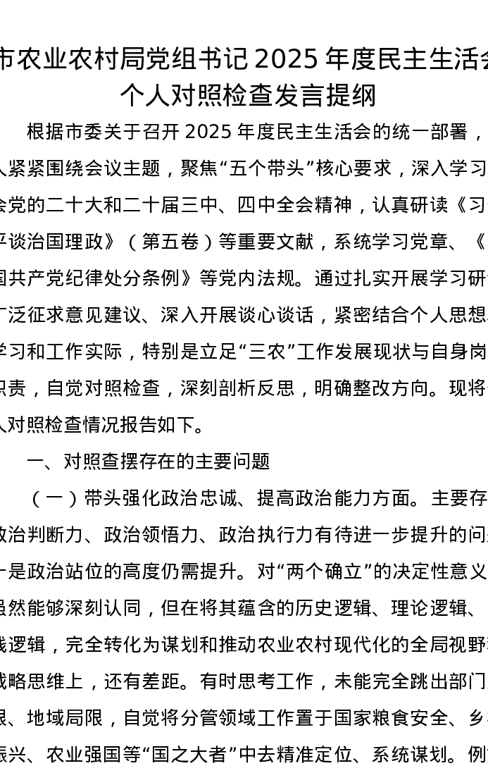 市农业农村局党组书记2025年度xxxxx个人对照检查发言提纲(五个带头)