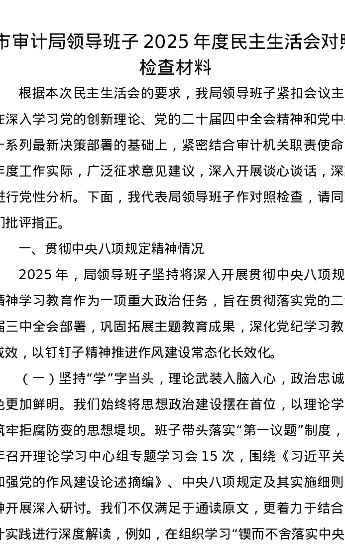 市审计局领导班子2025年度xxxxx对照检查材料(五个带头)