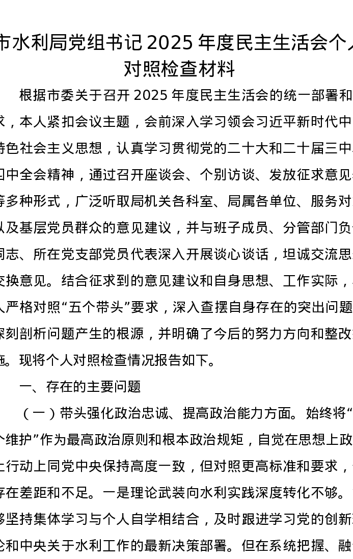 市水利局党组书记2025年度xxxxx个人对照检查材料(五个带头)