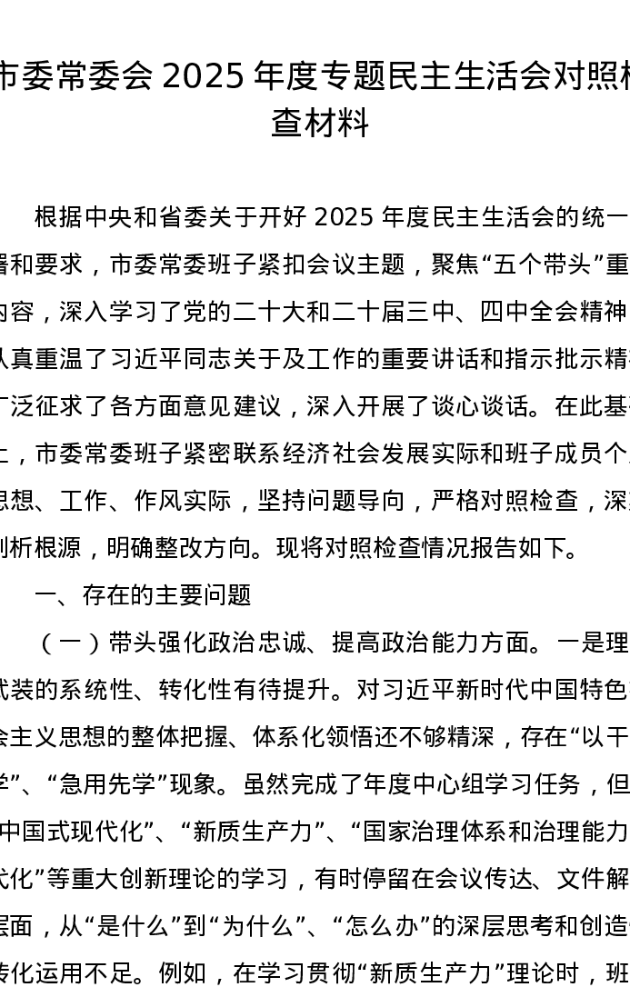 市委常委会2025年度专题xxxxx对照检查材料(五个带头)