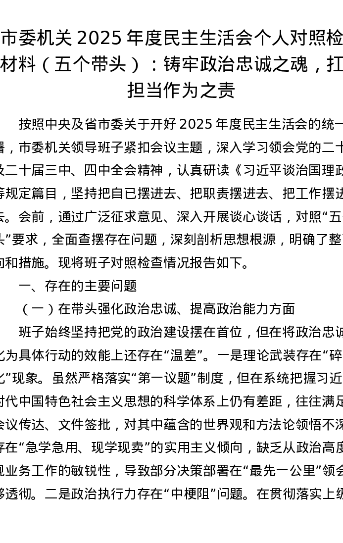 市委机关2025年度xxxxx个人对照检查材料(五个带头):铸牢政治忠诚之魂,扛起担当作为之责