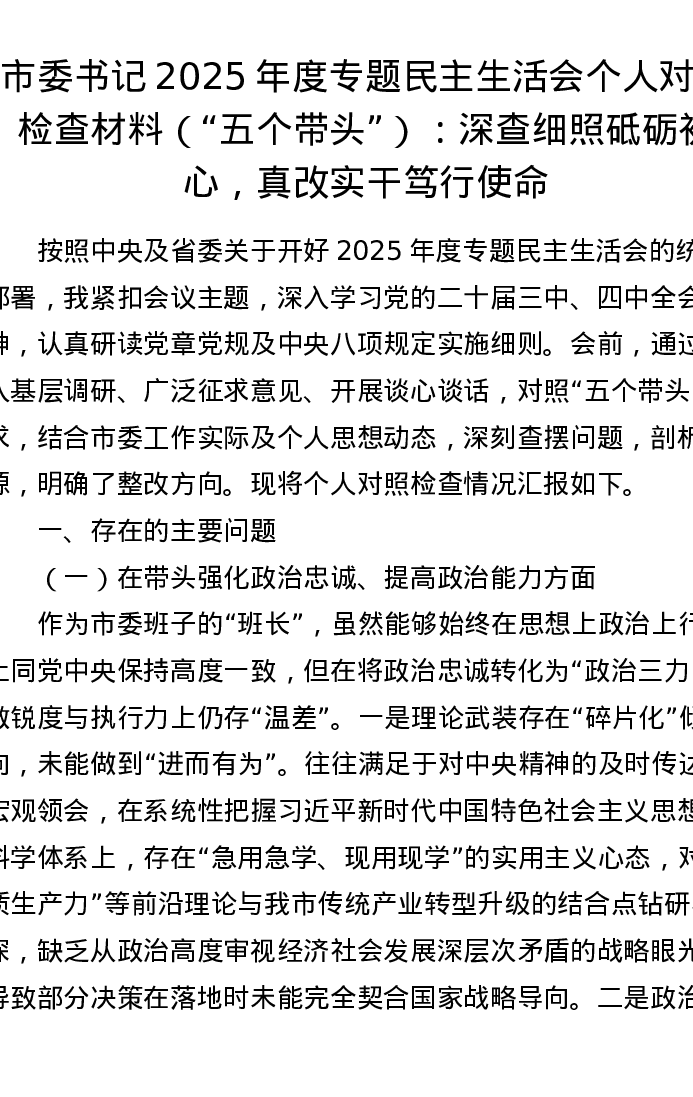 市委书记2025年度专题xxxxx个人对照检查材料(五个带头):深查细照砥砺初心,真改实干笃行使命