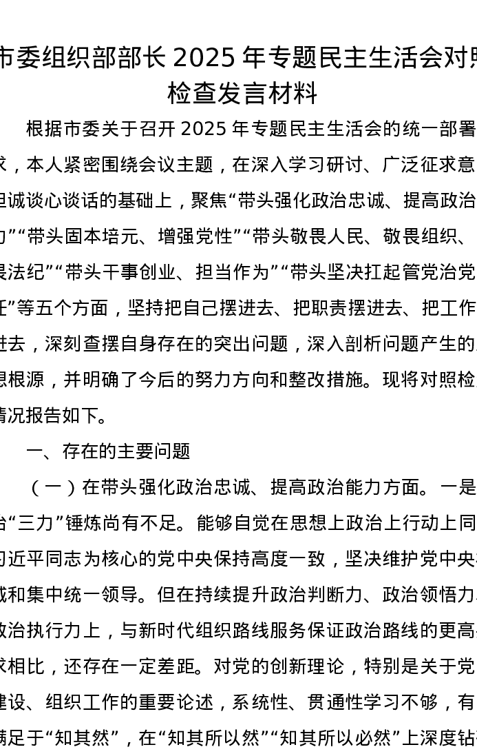 市委组织部部长2025年专题xxxxx对照检查发言材料(五个带头)