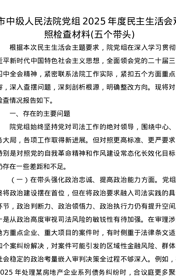市中级人民法院党组2025年度xxxxx对照检查材料(五个带头)