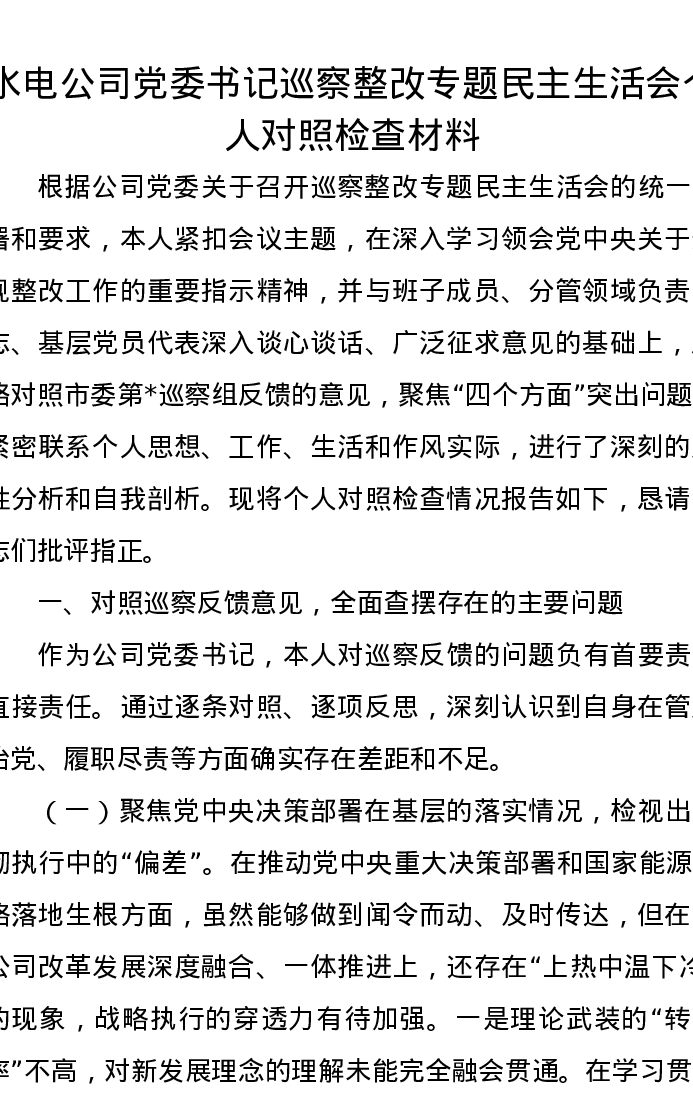 水电公司党委书记巡察整改专题xxxxx个人对照检查材料