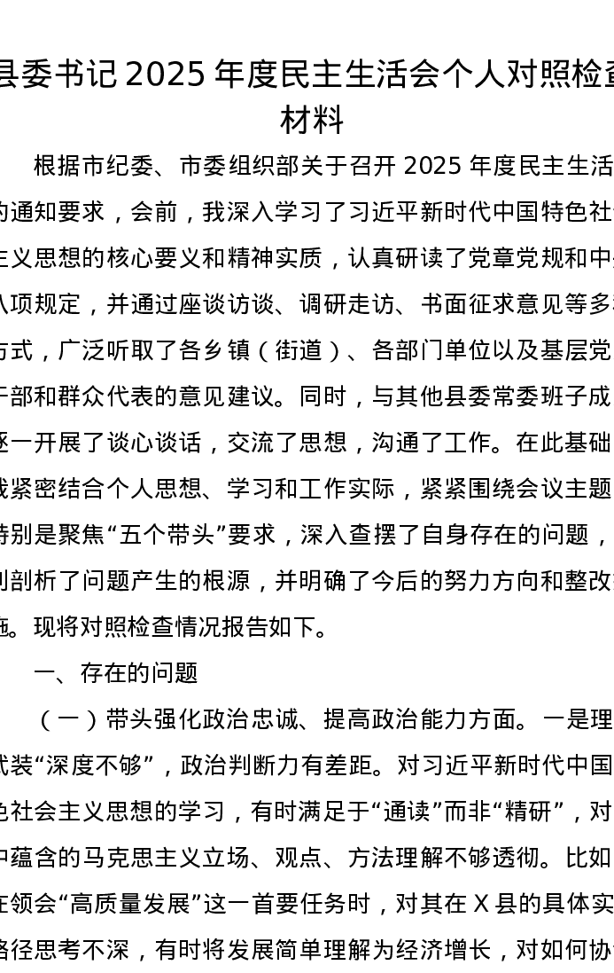 县委书记2025年度xxxxx个人对照检查材料(五个带头)