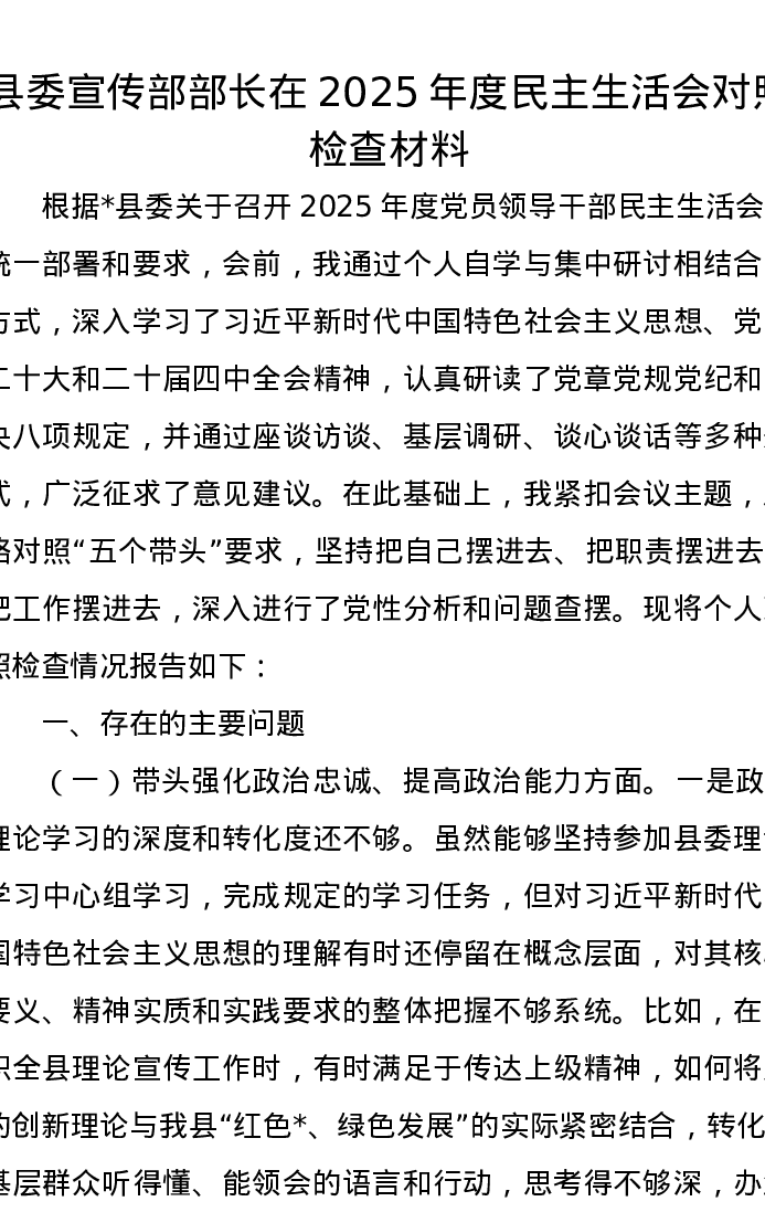 县委宣传部部长在2025年度xxxxx对照检查材料(五个带头)