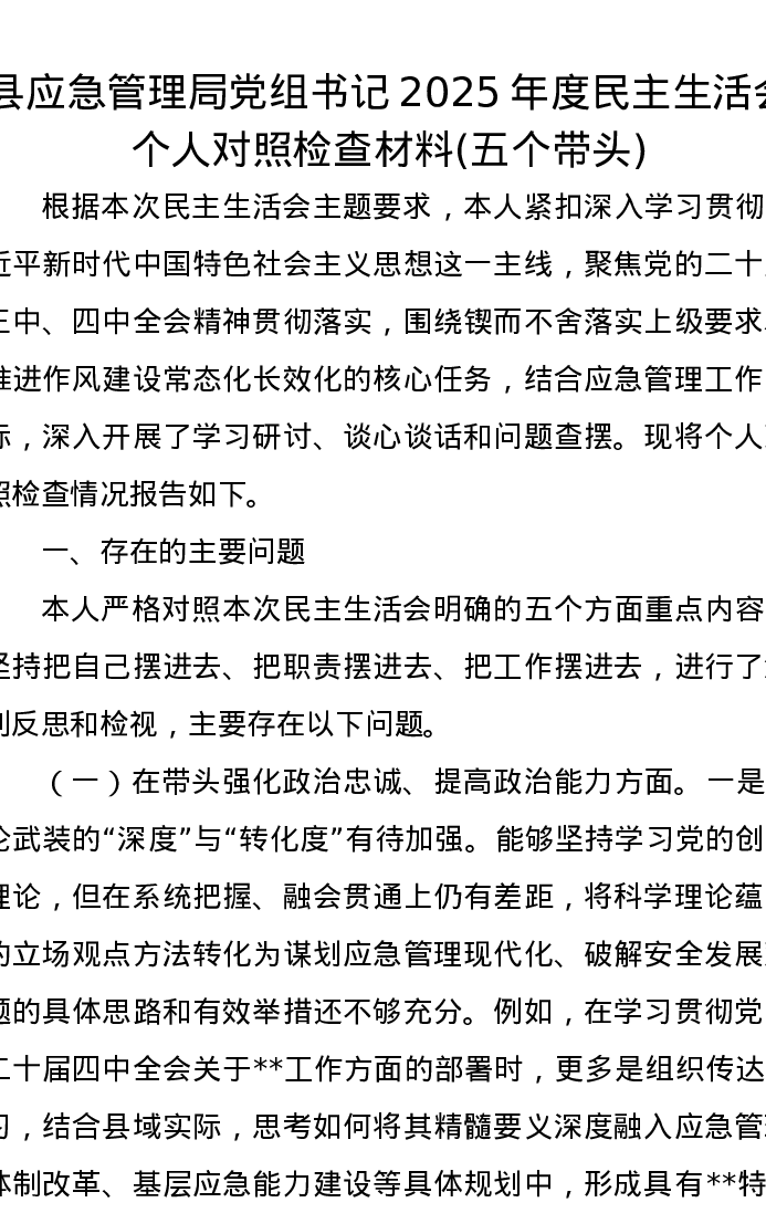 县应急管理局党组书记2025年度xxxxx个人对照检查材料(五个带头)
