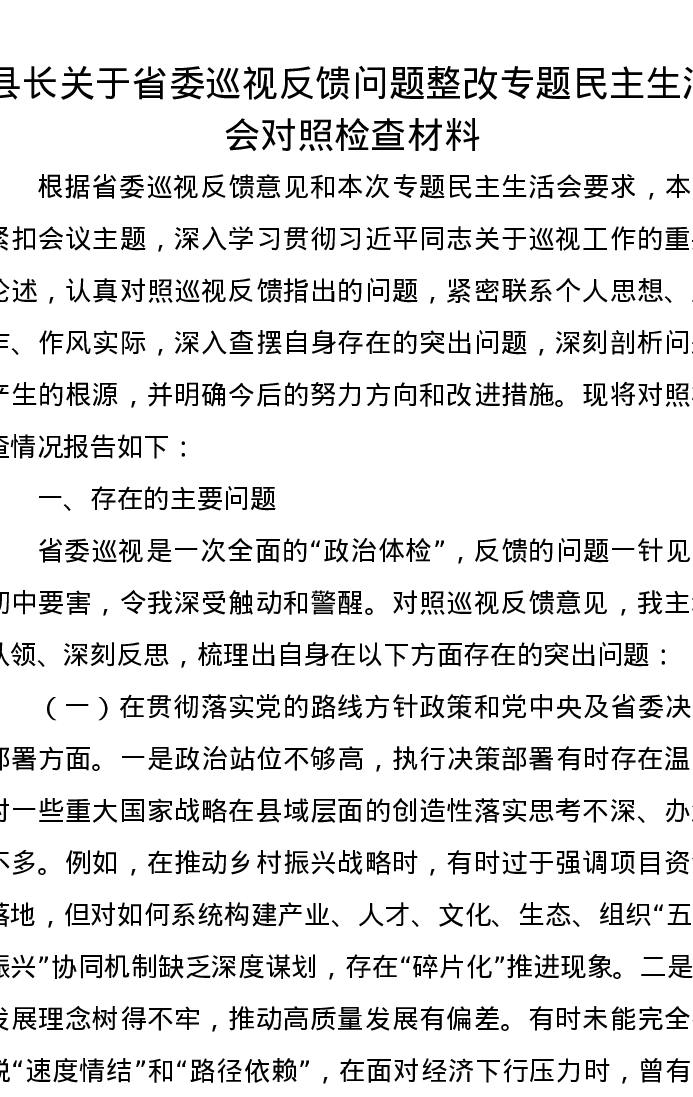 县长关于省委巡视反馈问题整改专题xxxxx对照检查材料