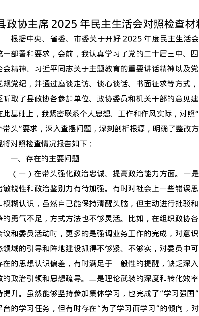县政协主席2025年xxxxx对照检查材料(五个带头)