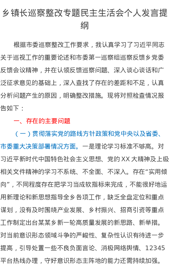 乡镇长巡察整改专题xxxxx个人发言提纲