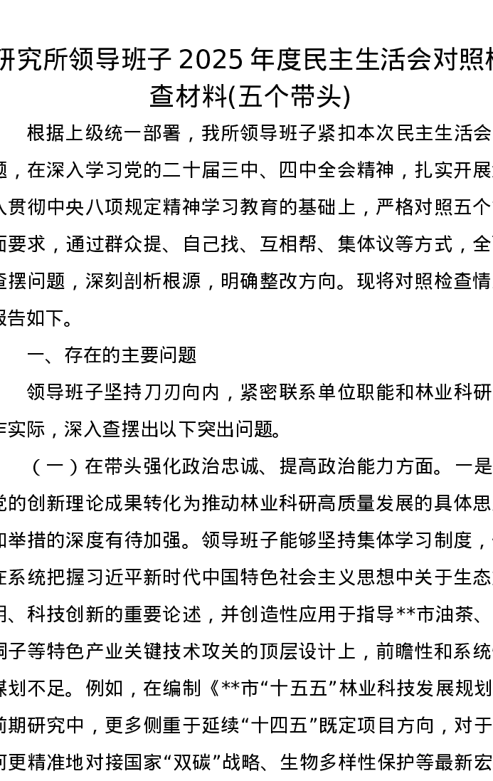 研究所领导班子2025年度xxxxx对照检查材料(五个带头)