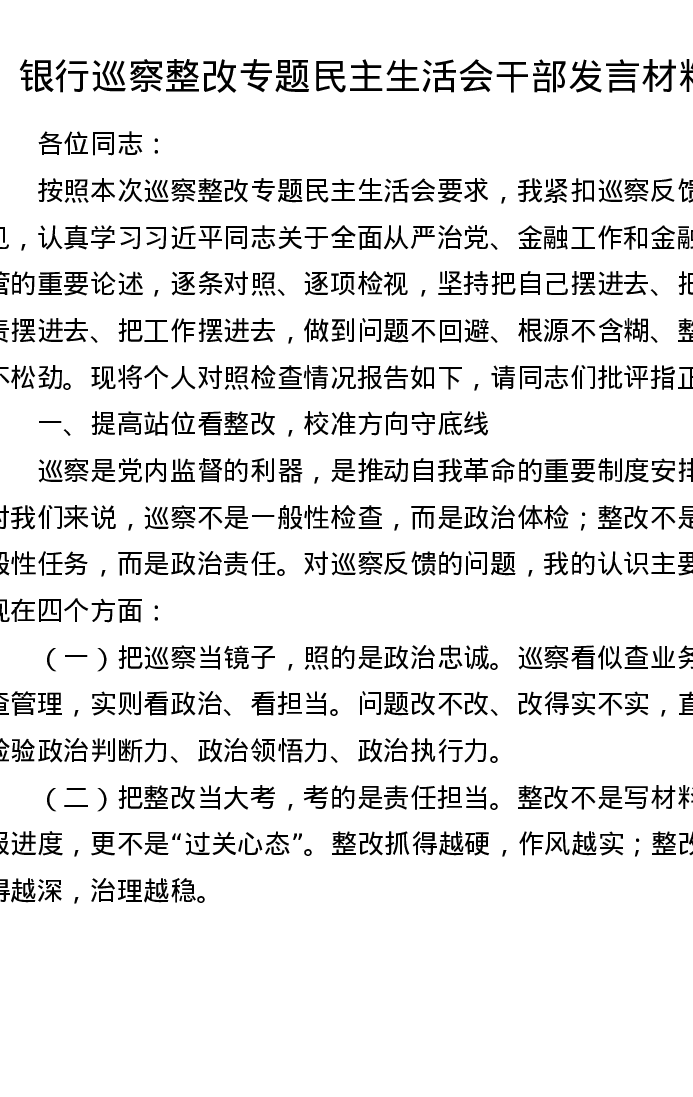 银行巡察整改专题xxxxx干部发言材料(3903字)