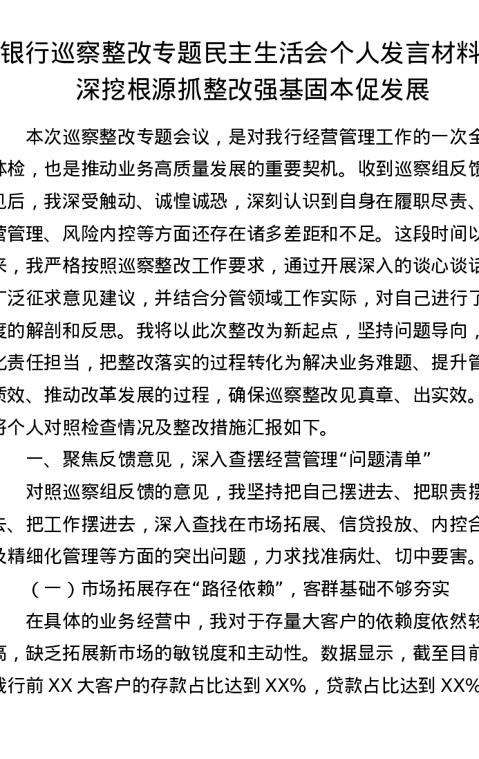 银行巡察整改专题xxxxx个人发言材料:深挖根源抓整改 强基固本促发展