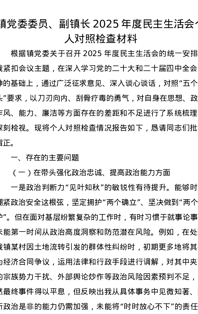 镇党委委员、副镇长2025年度xxxxx个人对照检查材料(五个带头)