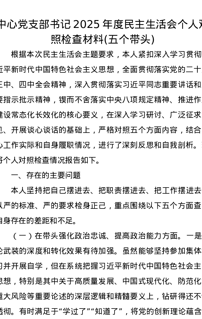 中心党支部书记2025年度xxxxx个人对照检查材料(五个带头)