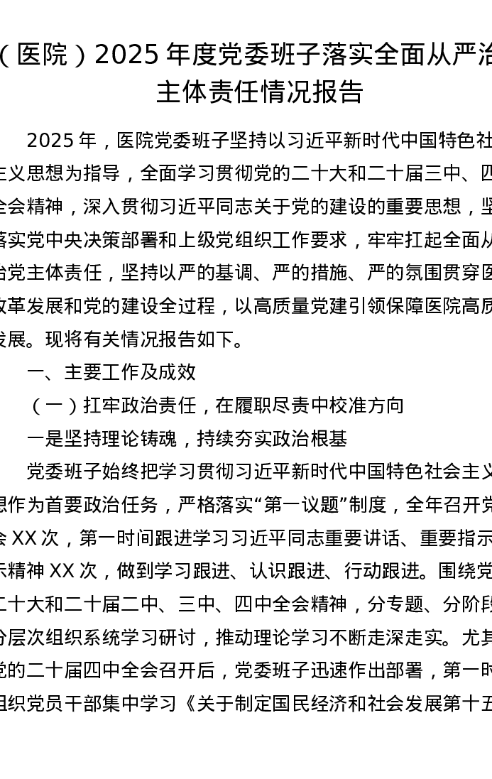 (医院)2025年度党委班子落实全面从严治党主体责任情况报告