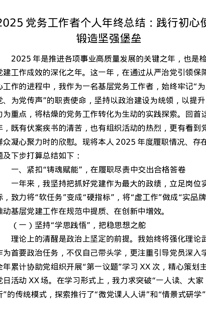 2025党务工作者个人年终总结:践行初心使命 锻造坚强堡垒