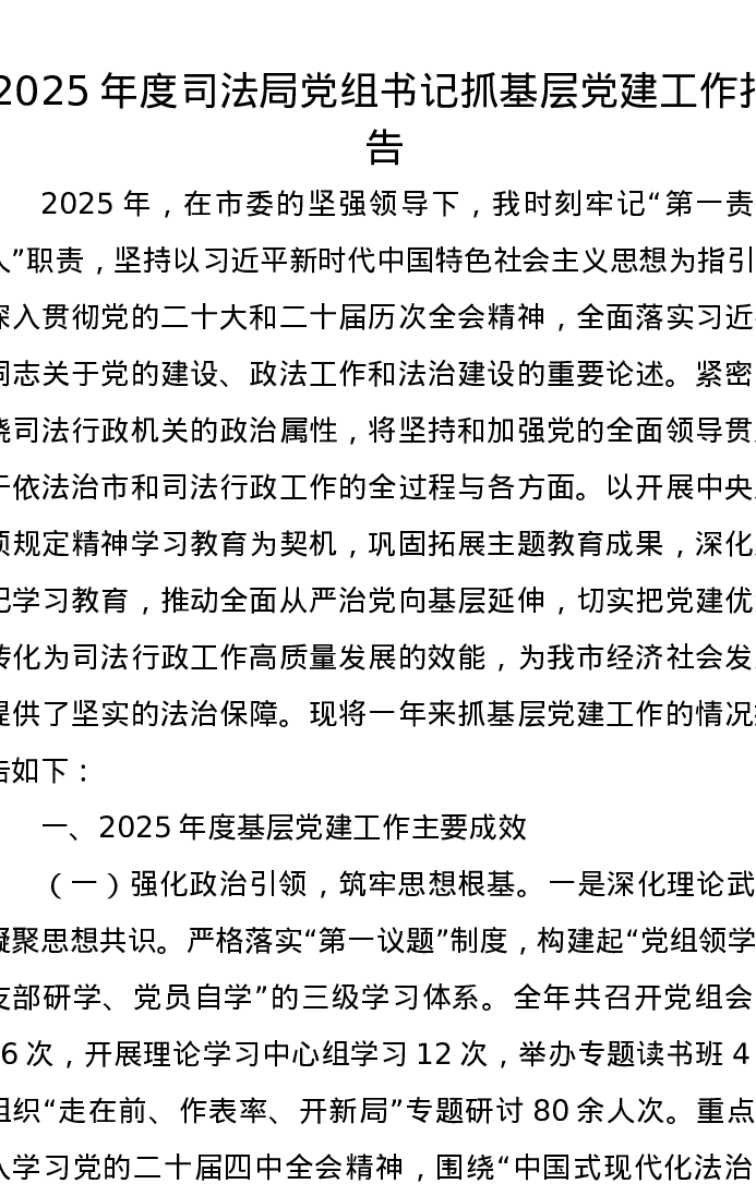 2025年度司法局党组书记抓基层党建工作报告