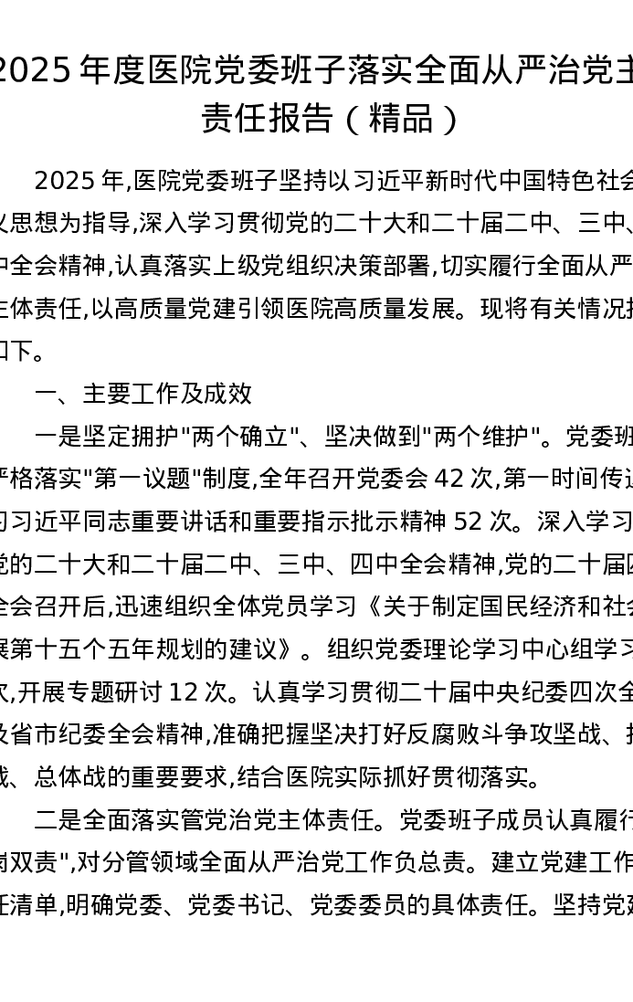 2025年度医院党委班子落实全面从严治党主体责任报告