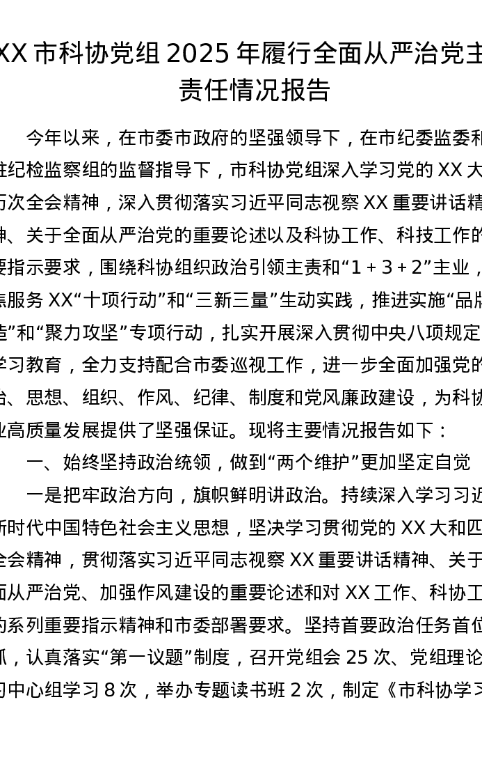 XX市科协党组2025年履行全面从严治党主体责任情况报告