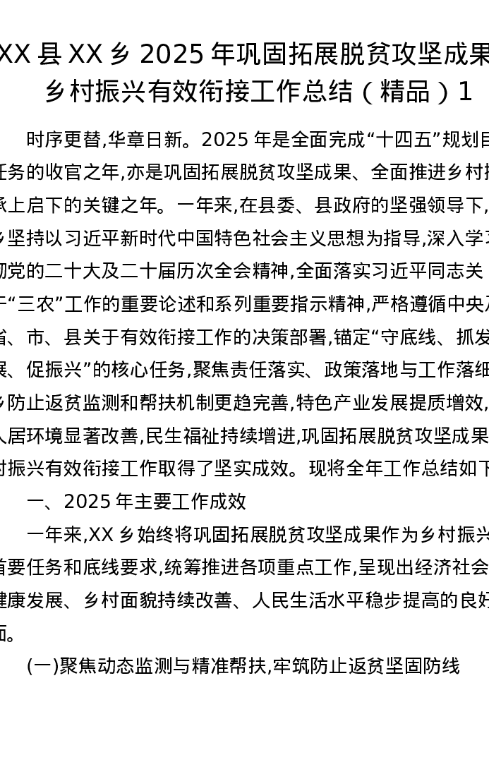 XX县XX乡2025年巩固拓展脱贫攻坚成果同乡村振兴有效衔接工作总结1