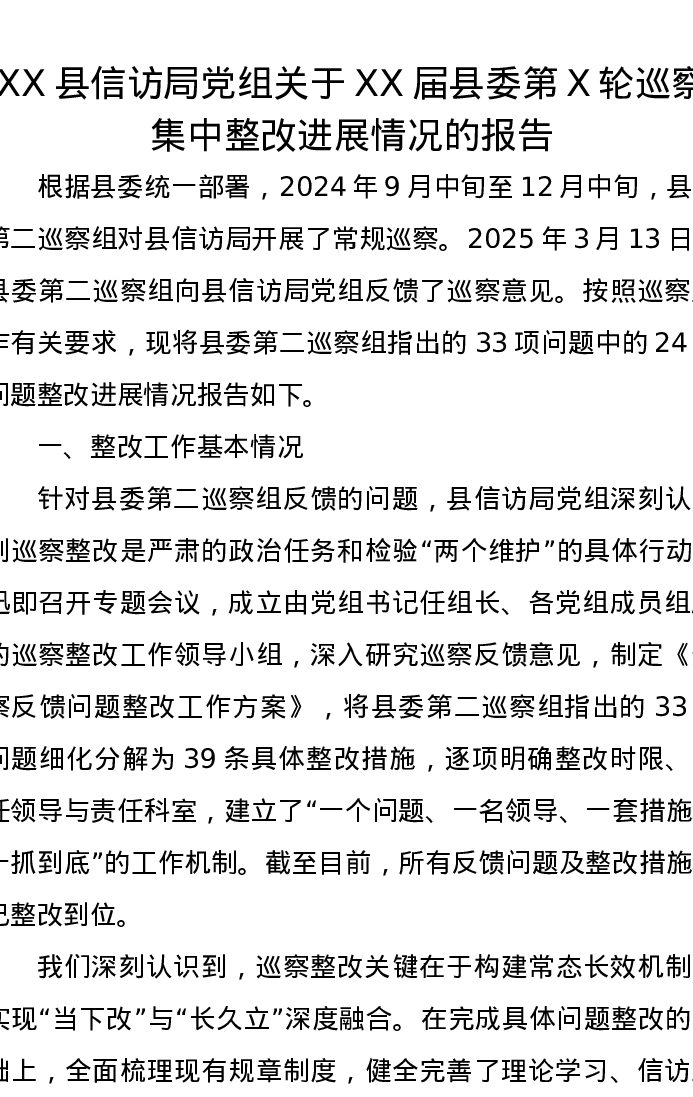 XX县信访局党组关于XX届县委第X轮巡察集中整改进展情况的报告