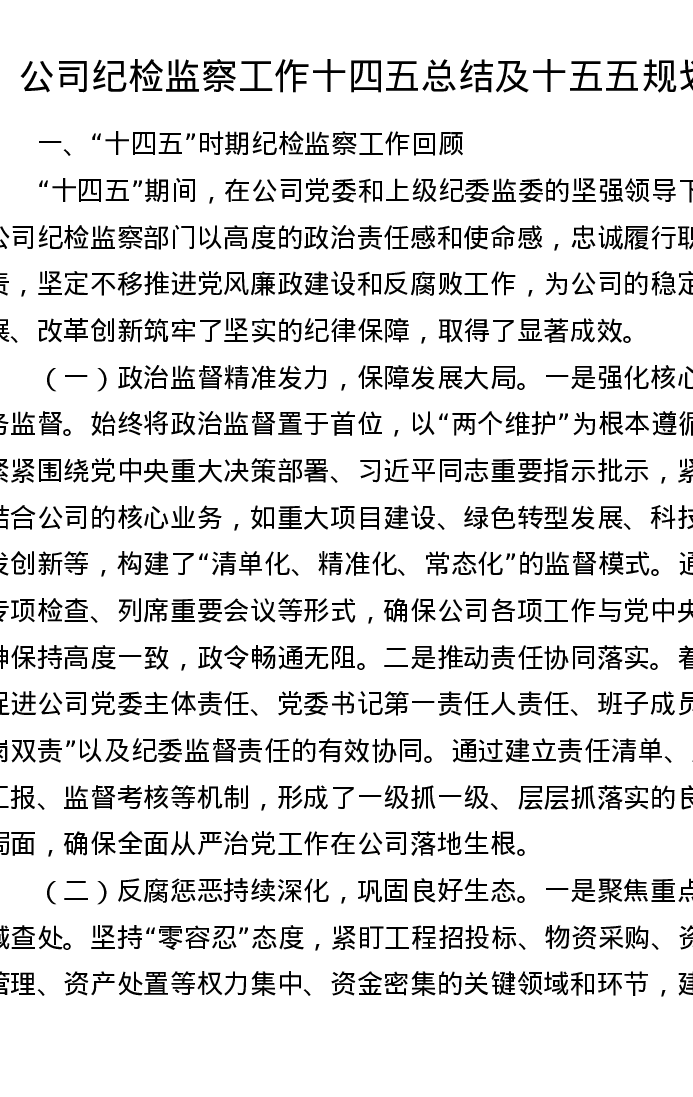 公司纪检监察工作十四五总结及十五五规划