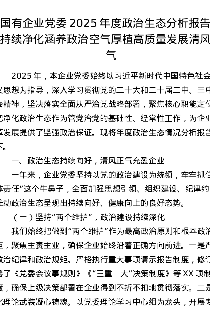 国有企业党委2025年度政治生态分析报告:持续净化涵养政治空气 厚植高质量发展清风正气