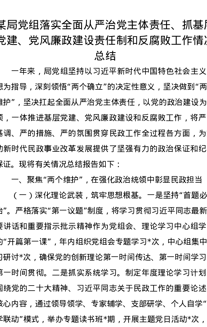 某局党组落实全面从严治党主体责任、抓基层党建、党风廉政建设责任制和反腐败工作情况总结
