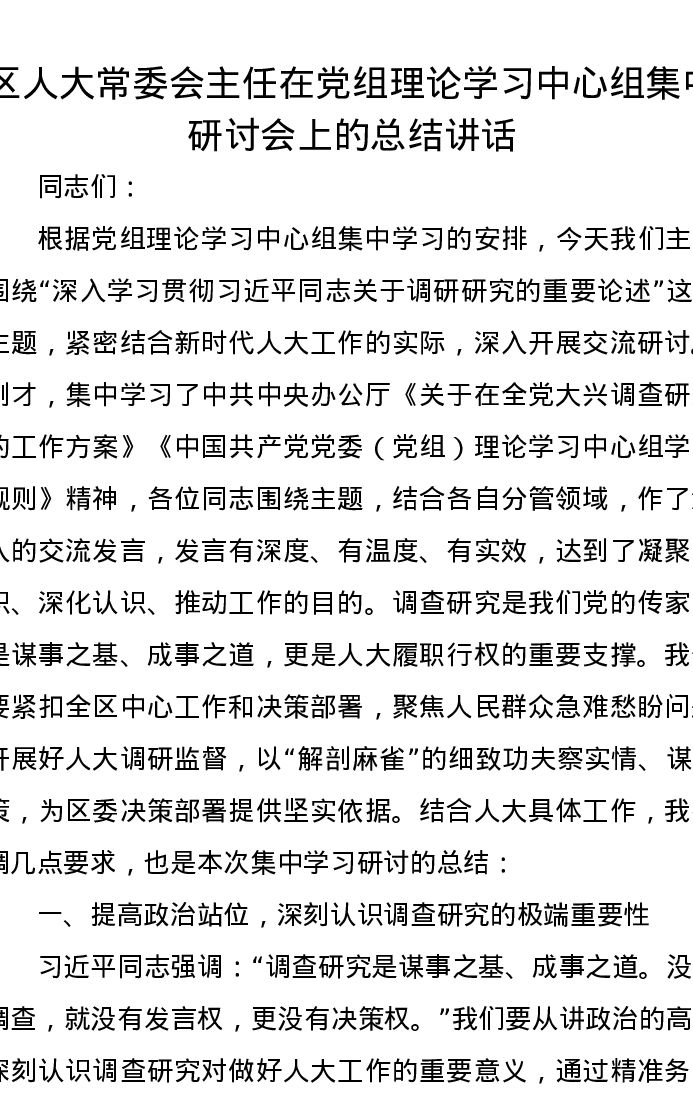 区人大常委会主任在党组理论学习中心组集中研讨会上的总结讲话