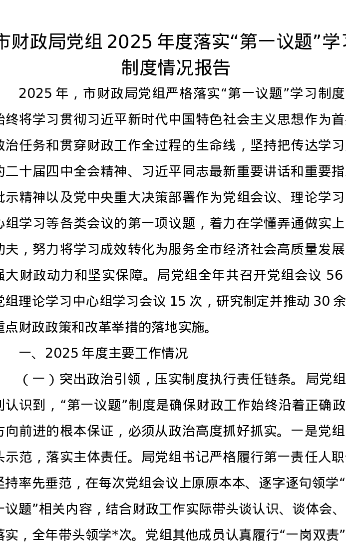 市财政局党组2025年度落实第一议题学习制度情况报告