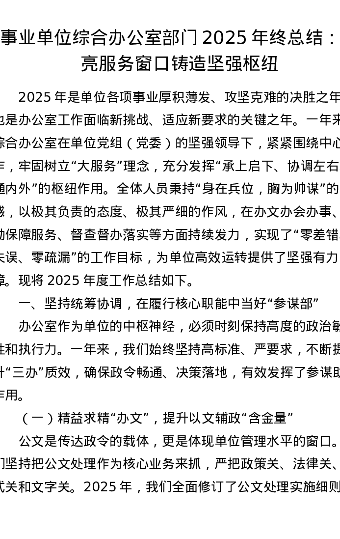 事业单位综合办公室部门2025年终总结:擦亮服务窗口 铸造坚强枢纽