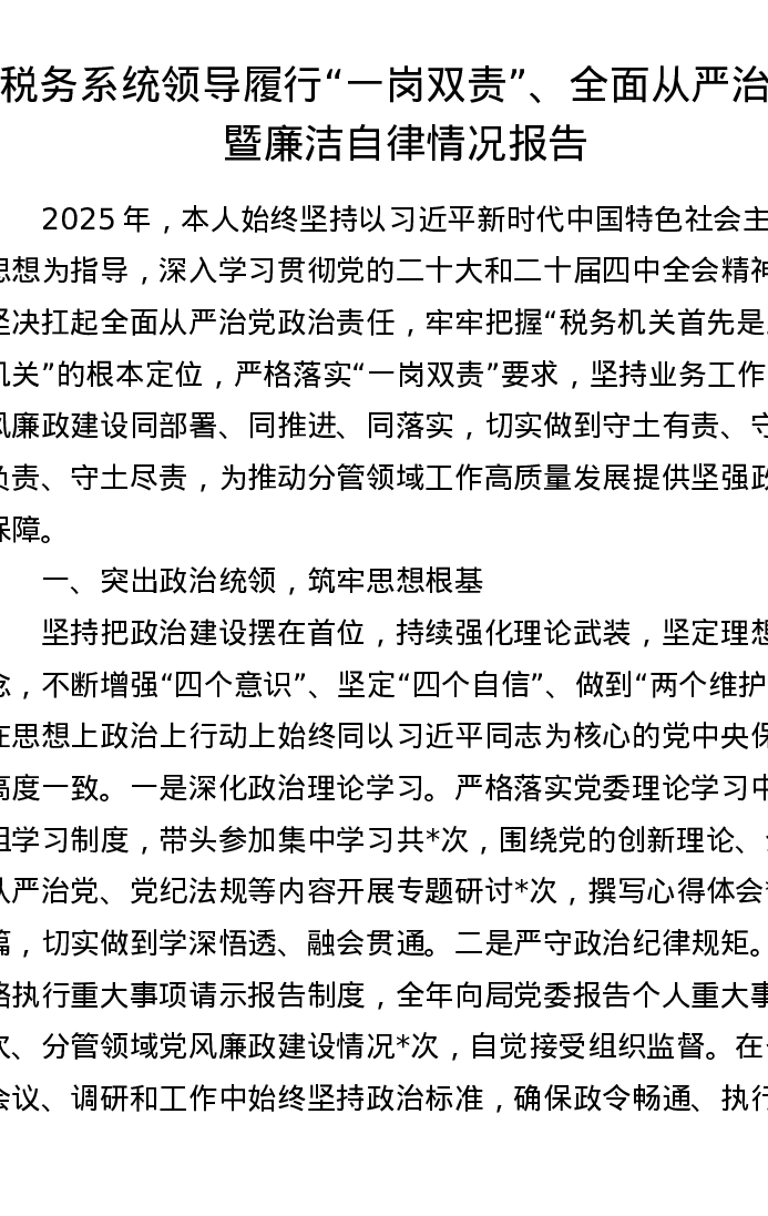 税务系统领导履行一岗双责、全面从严治党暨廉洁自律情况报告