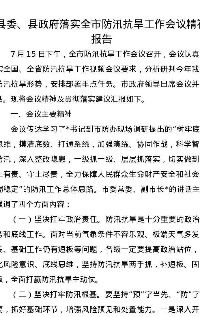 县委、县政府落实全市防汛抗旱工作会议精神报告