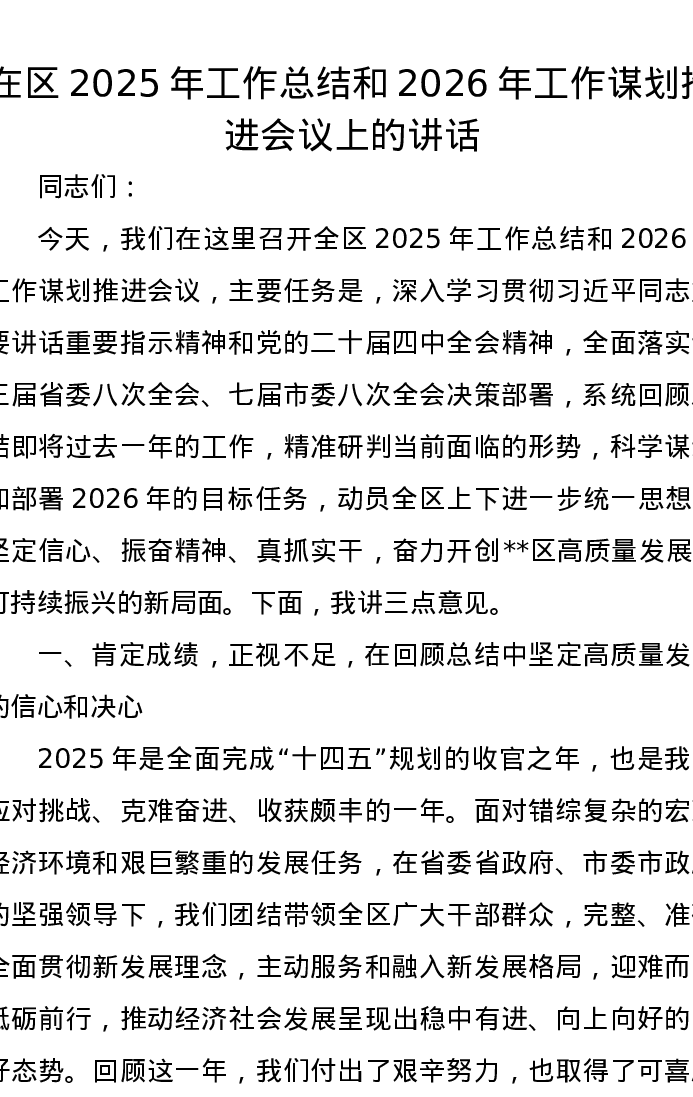 在区2025年工作总结和2026年工作谋划推进会议上的讲话