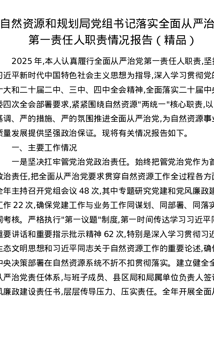 自然资源和规划局党组书记落实全面从严治党第一责任人职责情况报告