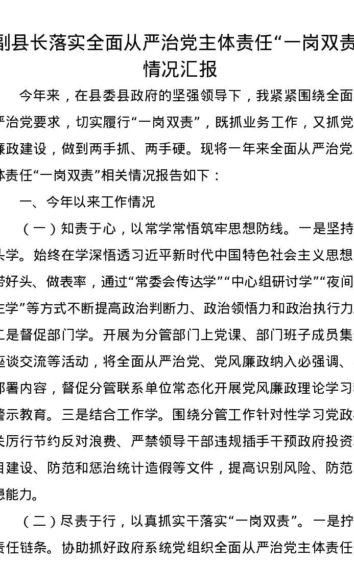 副县长落实全面从严治党主体责任一岗双责情况汇报