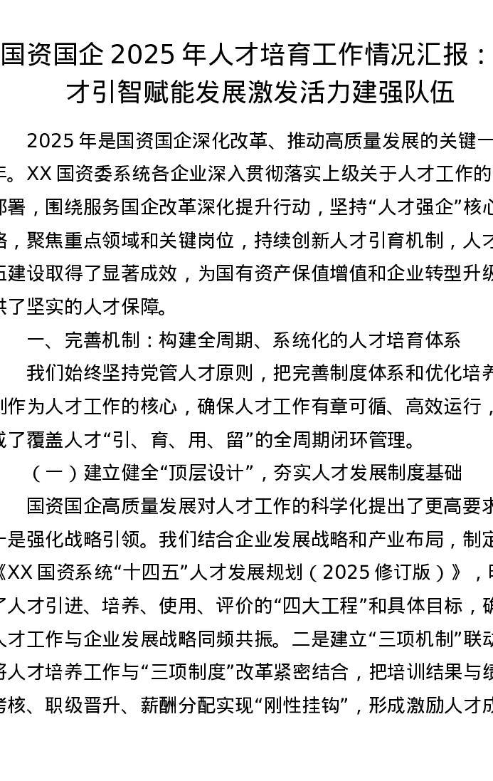 国资国企2025年人才培育工作情况汇报:聚才引智赋能发展 激发活力建强队伍